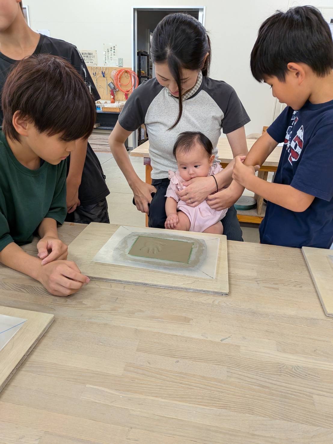 6歳までのお子様の手形を粘土に残す(記念プレート作り)の陶芸体験。