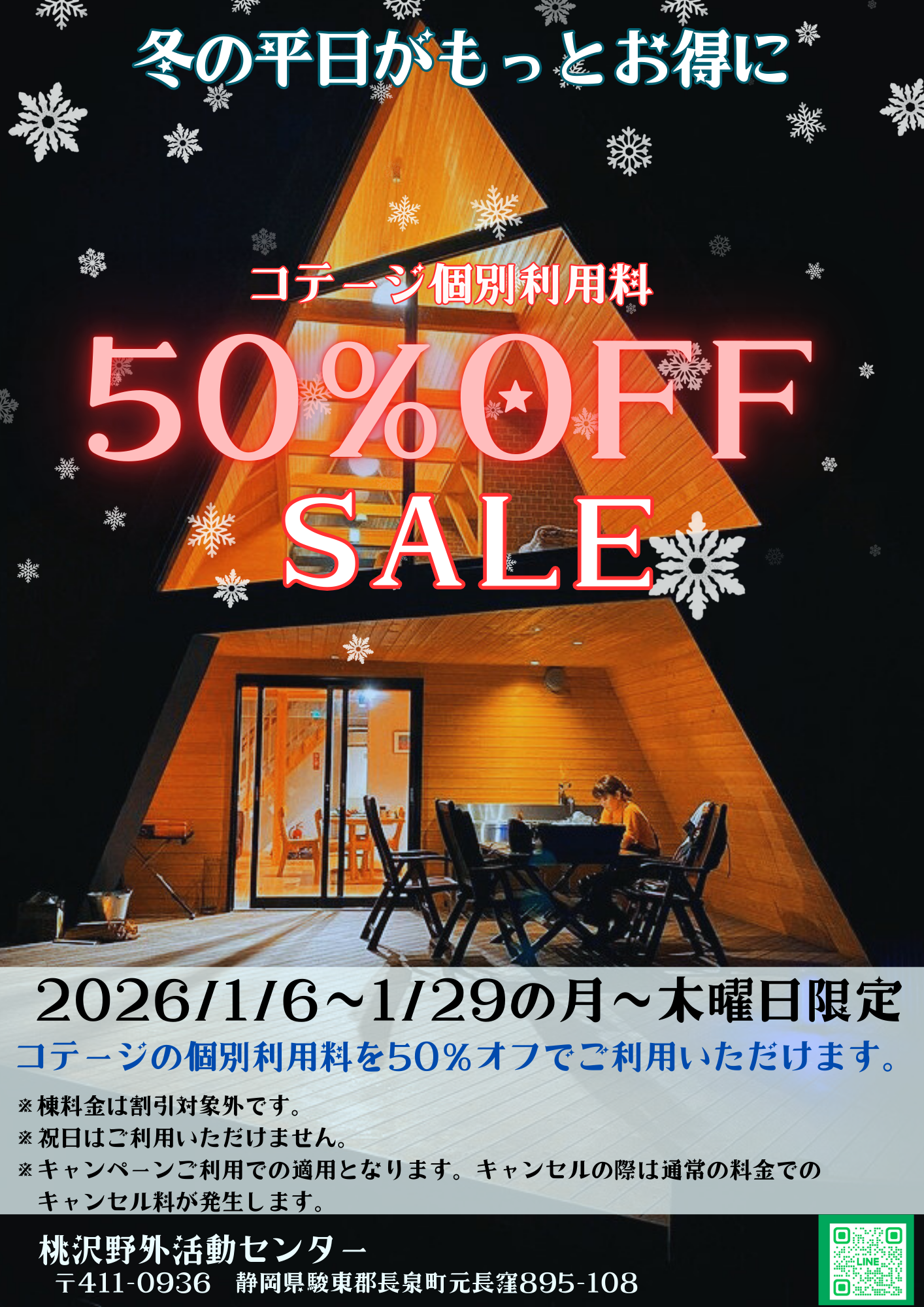2026年1月6日(月)から1月29日(木)までの期間、平日限定でコテージの個別利用料が50%オフになる「冬の平日限定割引キャンペーン」を実施します。
