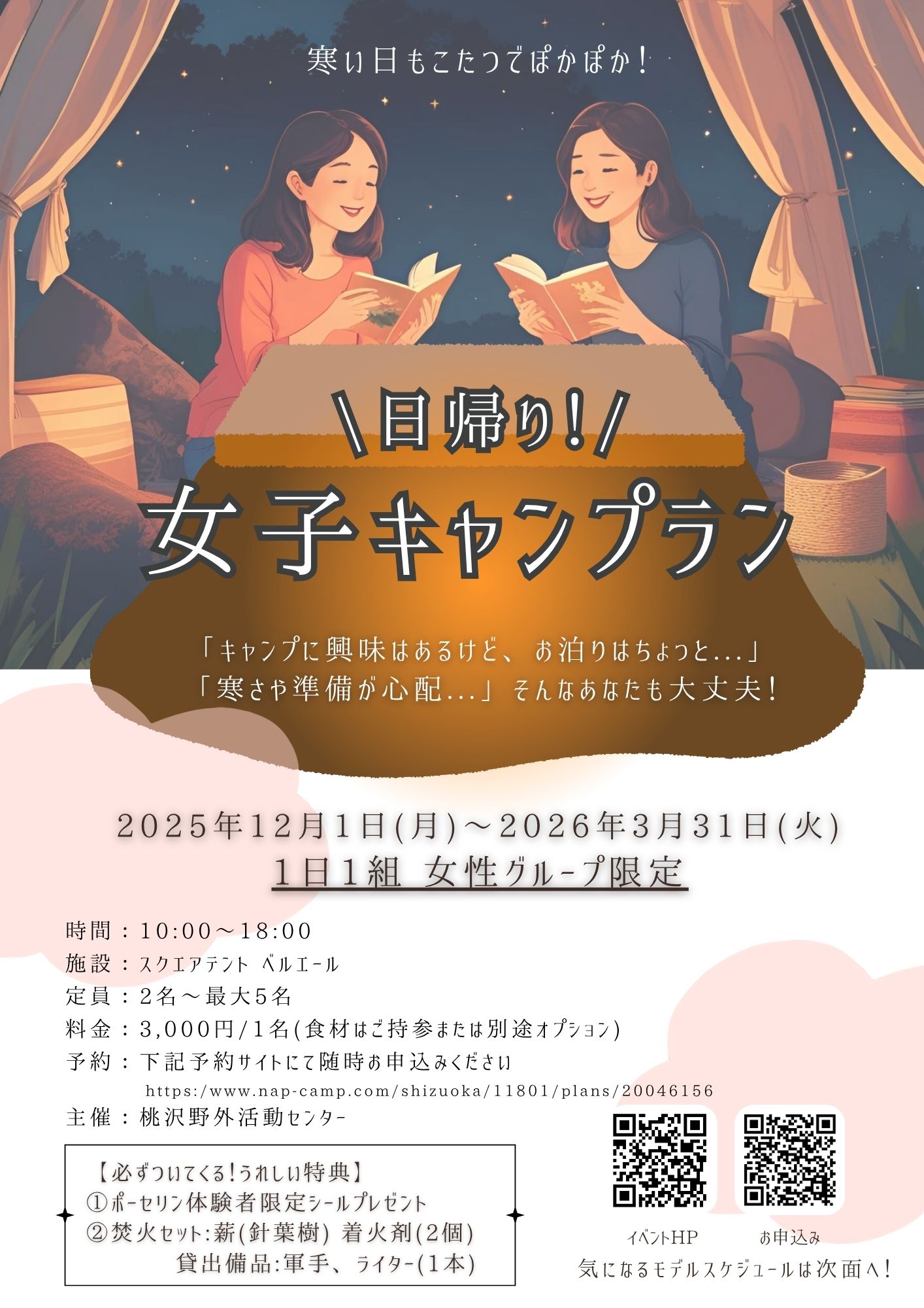 常設テント内のこたつで暖まりながら、ゆったりと女子キャンプをお楽しみいただけます。お友達同士での女子会にぴったりです。