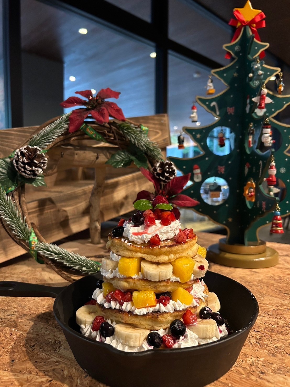 タワーパンケーキ作りでは鮮やかなフルーツでトッピングしながらパンケーキを重ねていきます。
