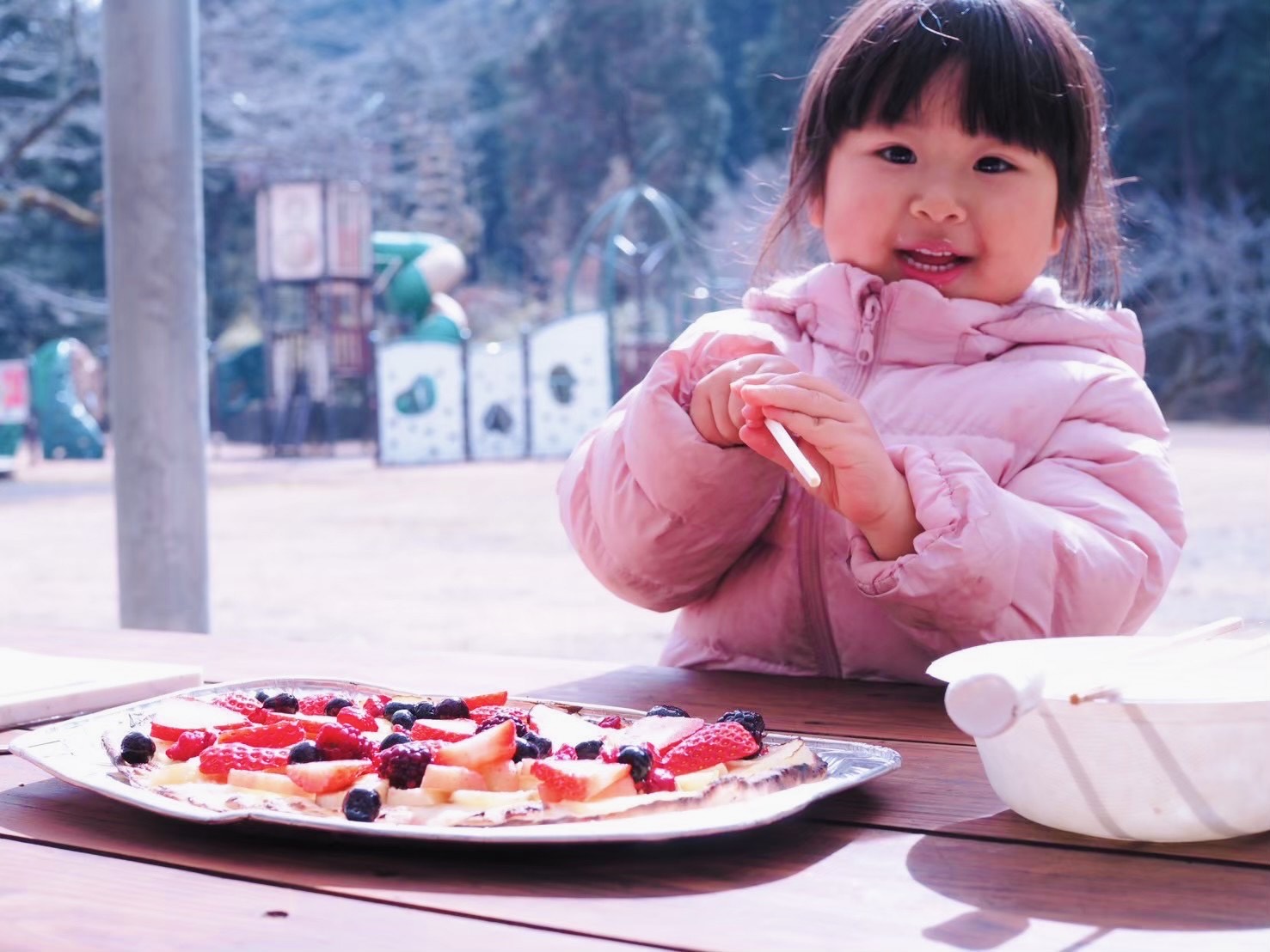フルーツピザは、季節のフルーツを含めた色々な具材を、親子で楽しみながら盛り付けていただきます。